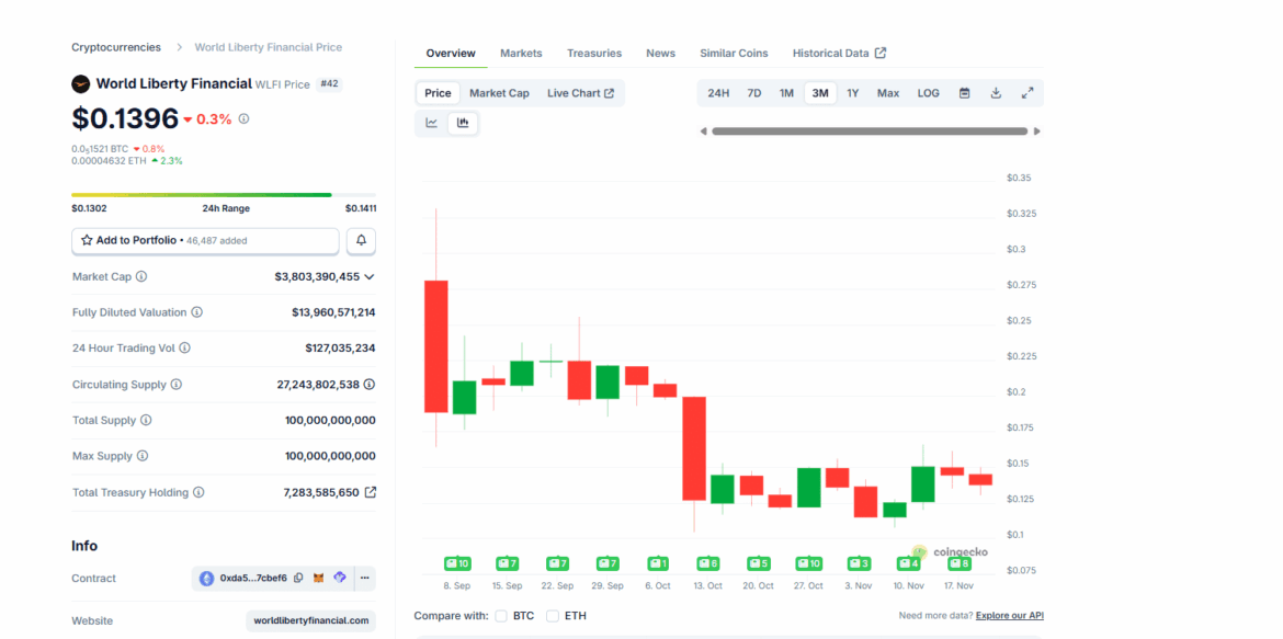 As of November 20, WLFI crypto had a market cap of over $3.8Bn, securing a spot in the top 50. On September 1, when it launched, the token initially rose to $0.33, then peaked and crashed nearly 60% to spot rates.