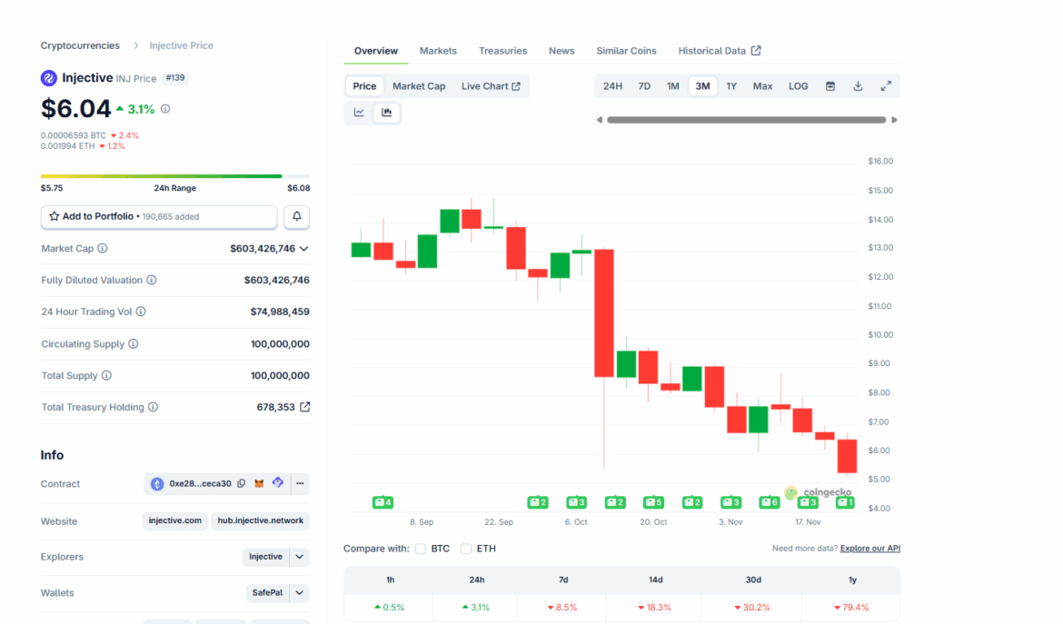 At spot rates, INJ USDT is stable, adding roughly +3% in the past 24 hours. Injective crypto remains in the red territory over the last week, down nearly -80% year-to-date.