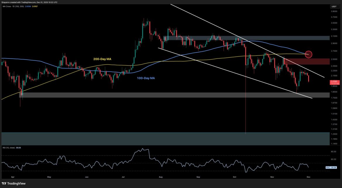 Both the 100-day and 200-day moving averages are curving downward and acting as dynamic resistance, while also printing a bearish crossover near the $2.60 mark. The RSI is also sinking below 40, showing weak momentum. The structure suggests that unless buyers reclaim the $2.50 level and break out of the descending channel, the trend will remain bearish, with $1.80 as the next possible support zone.
