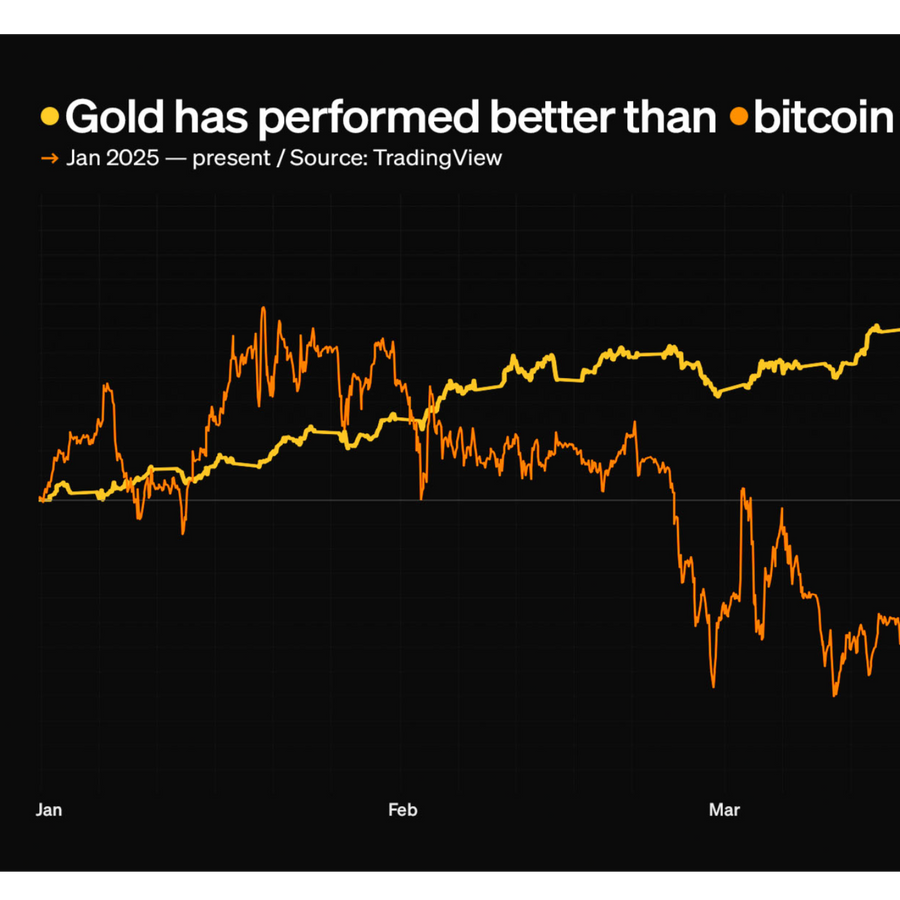 A year-to-date chart of gold versus BTC shows outperformance of the traditional safe haven asset amid geopolitical uncertainty.