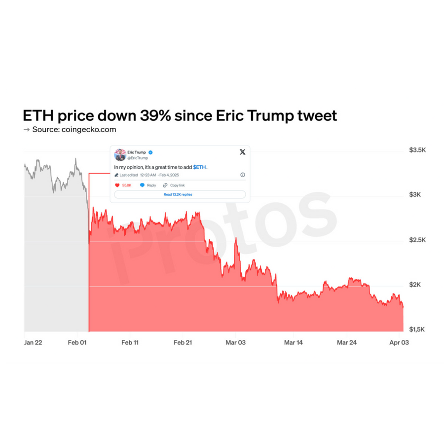 Back in February, Eric Trump tweeted, “great time to add $ETH. You can thank me later.” Its price has since declined 39%.