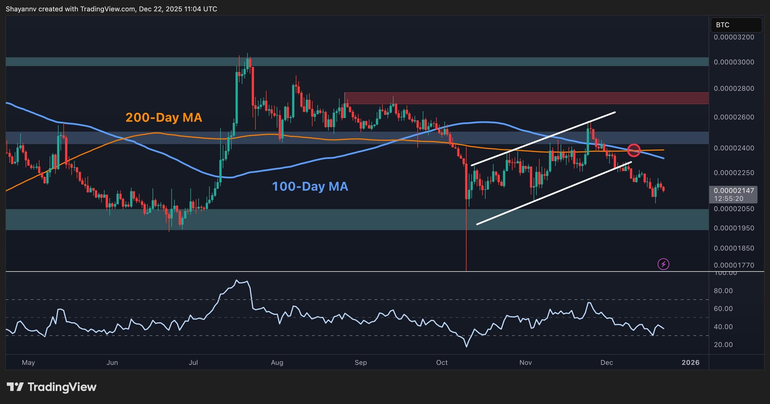 The BTC pair looks even worse. After forming a rising wedge in October and November, XRPBTC broke down hard in the last couple of weeks and is now trading just above 2,100 sats and below the 100 and 200-day moving averages. Both moving averages are located around the 2,300-2,400 sats zone.