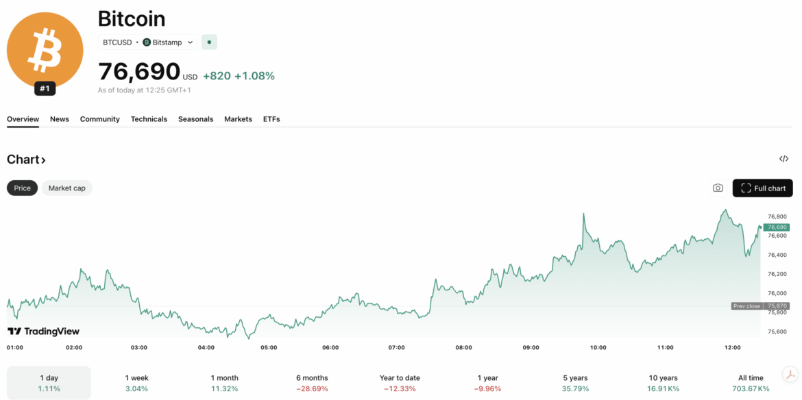 This development comes as Bitcoin holds steady above $76,000, with a +2% daily pump, as trading volume surges to over $41.9Bn, highlighting renewed demand for the leading digital asset.