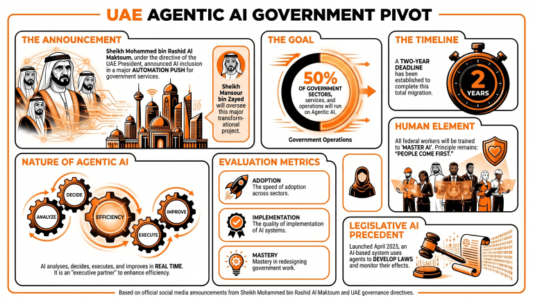 • UAE PM Al Maktoum announced a major pivot to run 50% of government operations on Agentic AI.