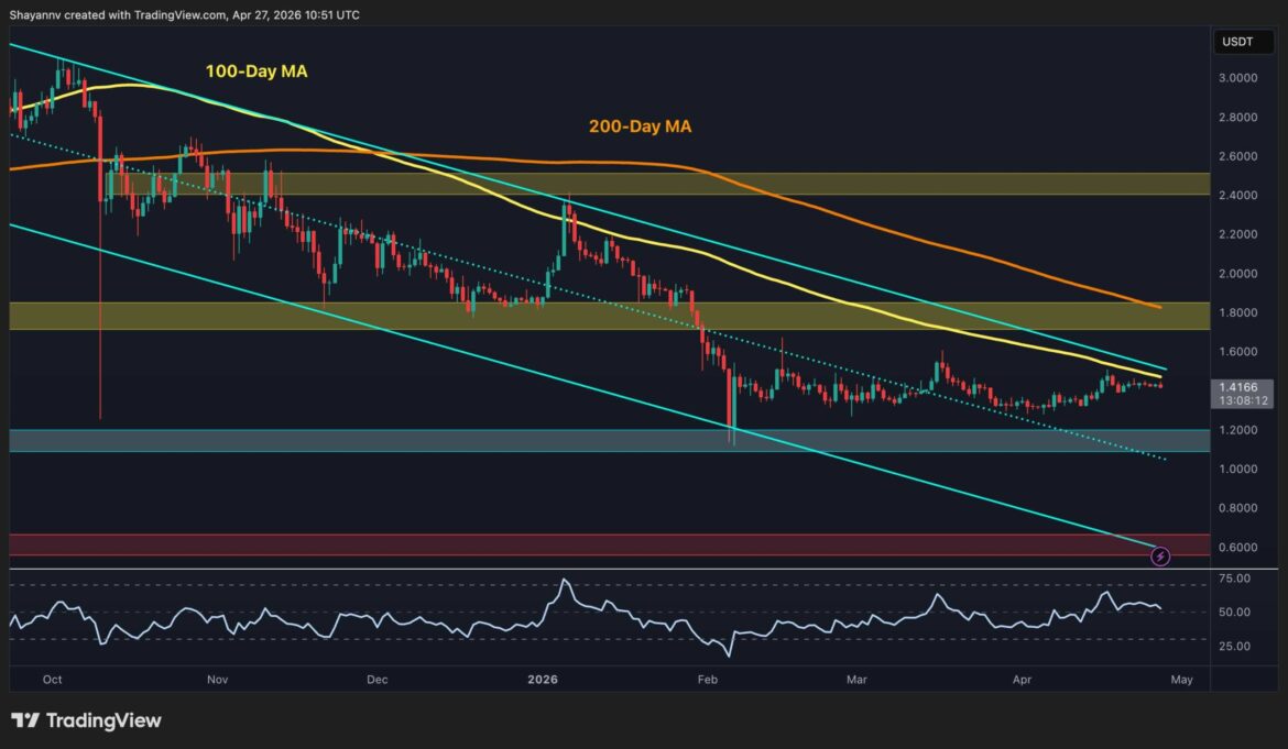 After spending the better part of Q1 2026 grinding sideways near the lows, XRP has quietly built a modest recovery setup. The asset is currently pressing against the upper boundary of the descending channel that has governed the price action since the October 2025 peak near $3.00, and for the first time in several months. The RSI has been hovering above 50, signaling that buyers are showing up with slightly more conviction than before.